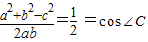 已知△ABC的三个内角A,B,C的对边分别是a,b,c,且a2-c2+b2=ab,则角C等于( )