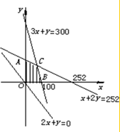 由$\left\{\begin{array}{l}{3x+y=300}\\{x+2y=252}\end{array}\right.$得$\left\{\begin{array}{l}{x=69\frac{3}{5}}\\{y=91\frac{1}{5}}\end{array}\right.$,则C(69$\frac{3}{5}$,91$\frac{1}{5}$),