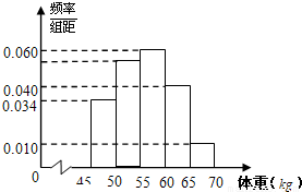 解答:解:根据频率分布直方图知,60kg以上频率为0.040×5+0.010×5=0.25,