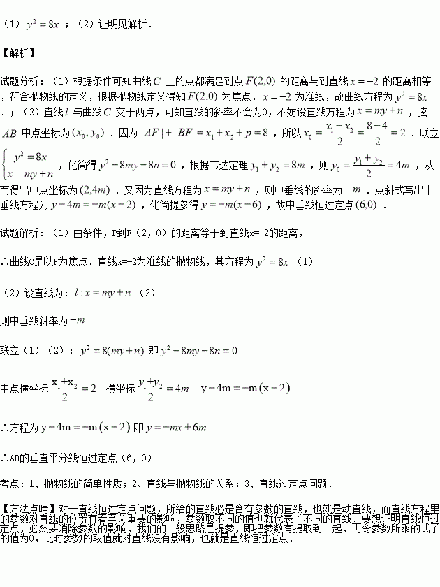 (2)一直线l与曲线C交于A,B两点,且|AF|+|BF|=8,证:AB的垂直平分线恒过定点.