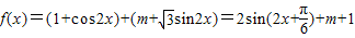 已知=(1+cos2x,1),=(1,)(x,m∈R),且f(x)=