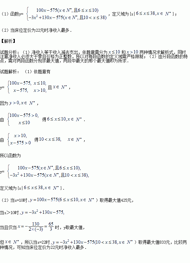 (2)试确定该宾馆将床位定价为多少时,既符合上面的两个条件,又能使净收入最多?