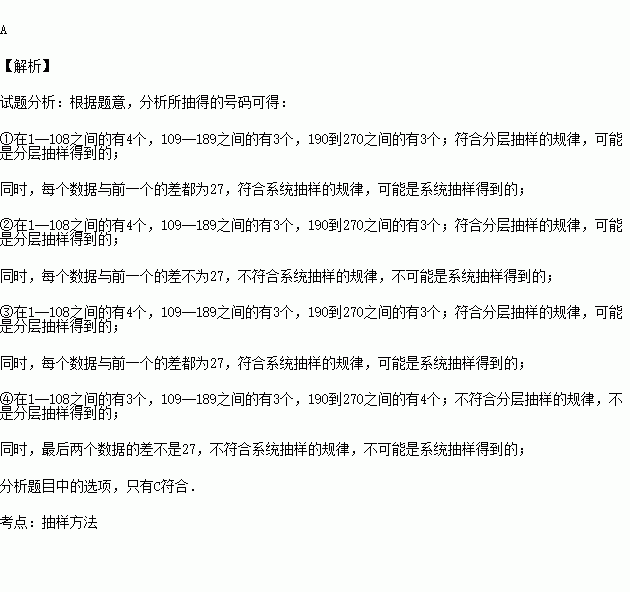 某初级中学有学生270人,其中一年级108人,二、三年级各81人,现要利用抽样方法抽取10人参加某项调查,考虑选用简单随机抽样、分层抽样和系统抽样三种方案,使用简单随机抽样和分层抽样时,将学生按一、二、三年级依次统一编号为1,2,…,270;使用系统抽样时,将学生统一随机编号1,2,…,270,并将整个编号依次分为10段.如果抽得号码有下列四种情况:
