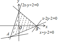 联立$\left\{\begin{array}{l}{2x-y+2=0}\\{x-2y-2=0}\end{array}\right.$,解得A(-2,-2),由图得B(2,0).