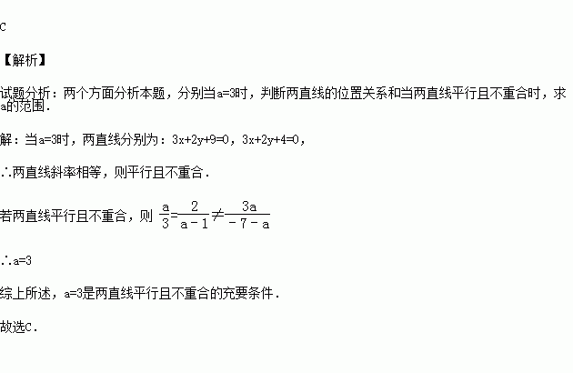 (2001•上海)a=3是直线ax+2y+3a=0和直线3x+(a﹣1)y=a﹣7平行且不重合的( )