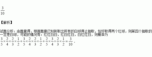 已知盒中有大小相同的3个红球和2个白球,若每次不放回的从盒中取一个球,一直到取出所有白球时停止抽取,则停止抽取时恰好取到两个红球的概率为 .