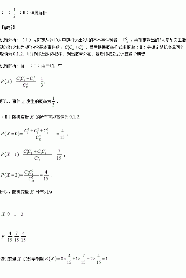 某小组共10人,利用假期参加义工活动,已知参加义工活动次数为1,2,3的人数分别为3,3,4,.现从这10人中随机选出2人作为该组代表参加座谈会.