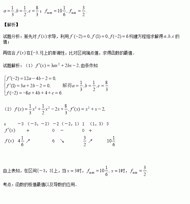 已知在时有极大值6,在时有极小值,求的值;并求在区间[-3,3]上的最大值和最小值.