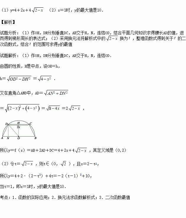 (本小题满分10分)如图,有一块半径为2的半圆形纸片,计划剪裁成等腰梯形ABCD的形状,它的下底AB是⊙O的直径,上底CD的端点在圆周上,设CD=2x,梯形ABCD的周长为y.