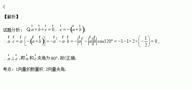 已知|a|=1,|b|=2, a与b的夹角为1200,且a+b+c=0,则a与c的夹角为( )