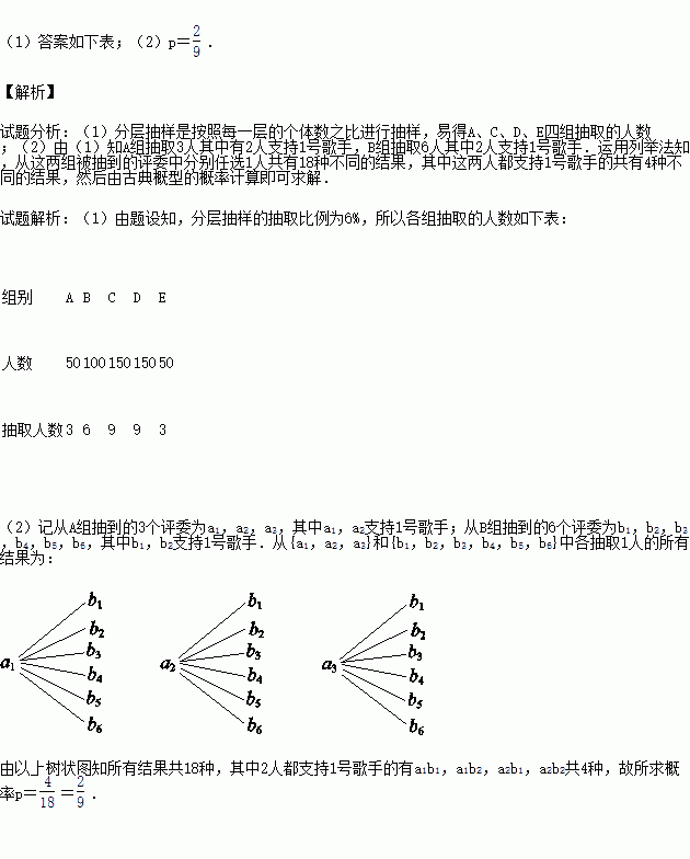(1)为了调查评委对7位歌手的支持情况,现用分层抽样方法从各组中抽取若干评委,其中从B组抽取了6人,请将其余各组抽取的人数填入下表.