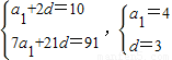 【答案】分析:(1)由a3=10,S7=91得a1,d的方程组,解出后按照等差数列的通项公式可得an,先由等比数列通项公式求得bn+1-bn,再用累加法可得bn