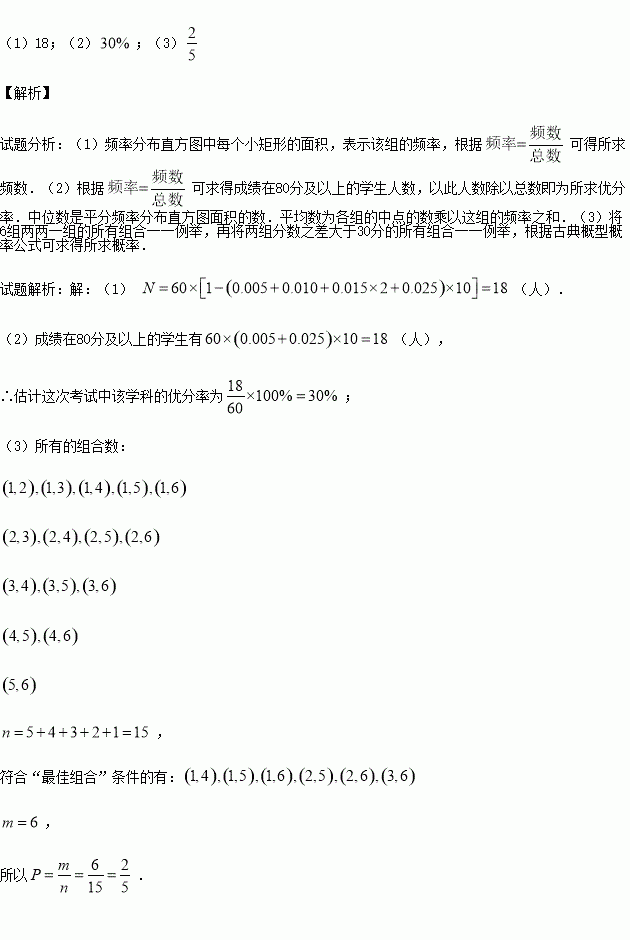 £¨3£©ÏÖ¸ù¾Ý±¾´Î¿¼ÊÔ·ÖÊý·Ö³ÉÏÂÁÐÁù¶Î£¨´ÓµÍ·Ö¶Îµ½¸ß·Ö¶ÎÒÀ´ÎΪµÚÒ»×é¡¢µÚ¶þ×é¡¢¡¡¢µÚÁù×飩ΪÌá¸ß±¾°àÊýѧÕûÌå³É¼¨£¬¾ö¶¨×éÓë×éÖ®¼ä½øÐаï·öѧϰ£®ÈôÑ¡³öµÄÁ½×é·ÖÊýÖ®²î´óÓÚ30·Ö£¨ÒÔ·ÖÊý¶ÎΪÒÀ¾Ý£¬²»ÒÔ¾ßÌåѧÉú·ÖÊýΪÒÀ¾Ý£©£¬Ôò³ÆÕâÁ½×éΪ¡°×î¼Ñ×éºÏ¡±£¬ÊÔÇóÑ¡³öµÄÁ½×éΪ¡°×î¼Ñ×éºÏ¡±µÄ¸ÅÂÊ£®