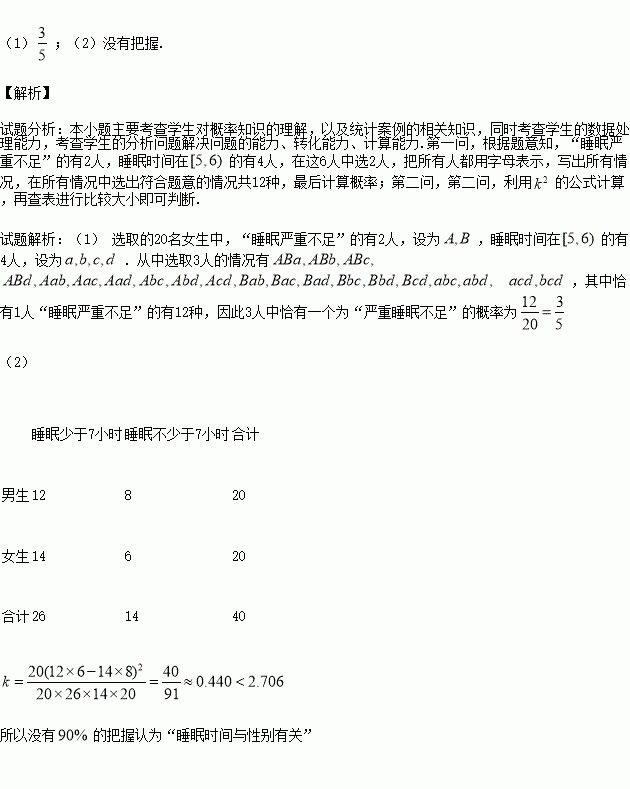 (1)现把睡眠时间不足5小时的定义为“严重睡眠不足”,从睡眠时间不足6小时的女生中随机抽取3人,求此3人中恰有一人为“严重睡眠不足”的概率;