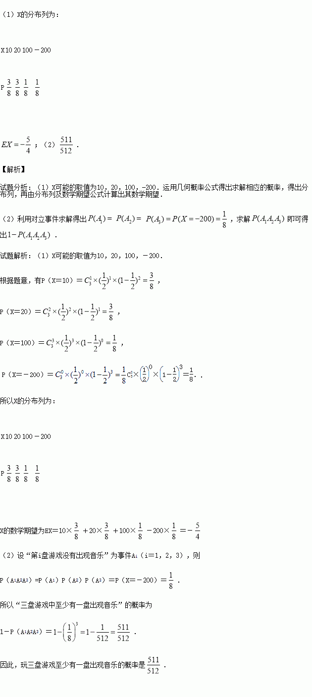 (本小题满分13分)一款击鼓小游戏的规则如下:每盘游戏都需击鼓三次,每次击鼓要么出现一次音乐,要么不出现音乐;每盘游戏击鼓三次后,出现一次音乐获得10分,出现两次音乐获得20分,出现三次音乐获得100分,没有出现音乐则扣除200分(即获得-200分).设每次击鼓出现音乐的概率为