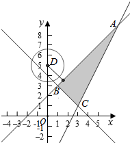 解:由x2+y2-10y+23≤0得x2+(y-5)2≤2,对应的图象以D(0,5)为圆心,半径r=$\sqrt{2}$的圆及其内部,