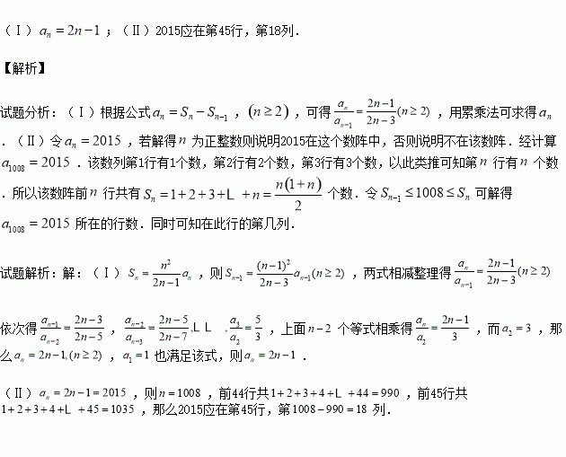 的项按上小下大,左小右大的原则排列成一个如图所示的三角形数阵,那么2015是否在该数阵中,若在,排在了第几行第几列?