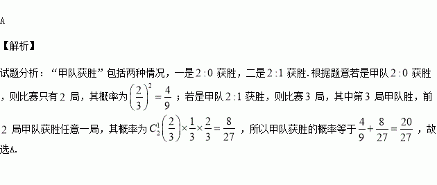 ,没有平局,若采用三局两胜 制比赛,即先胜两局者获胜且比赛结束,则甲队获胜的概率等于( )