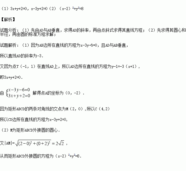 如图,矩形ABCD的两条对角线相交于点M(2,0),AB边所在直线的方程为x-3y-6=0,点T(-1,1)在AD边所在的直线上.