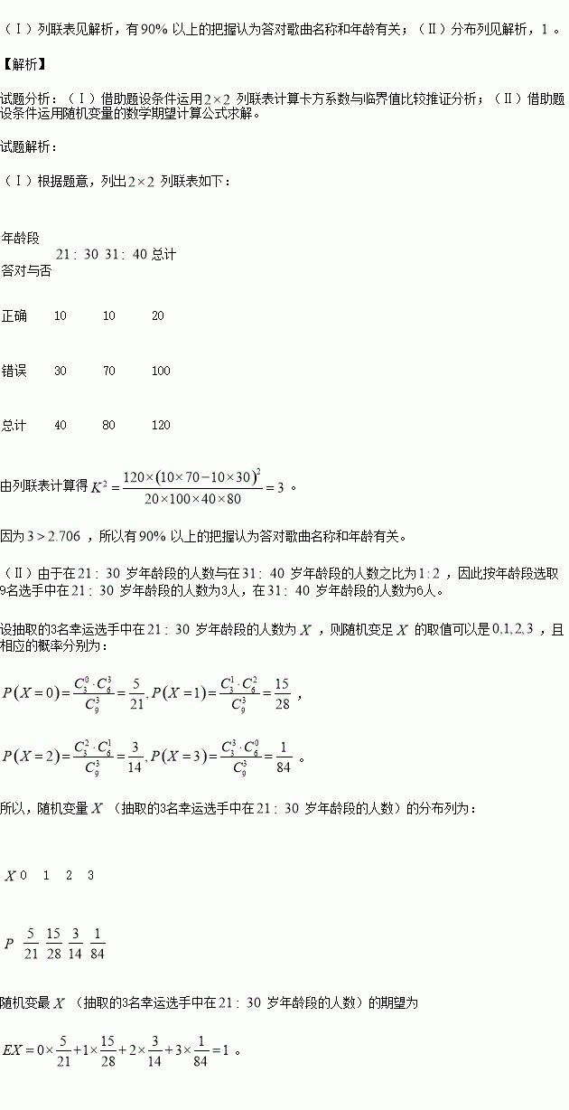 (单位:岁),统计这两个年龄段选手答对歌曲名称与否的人数如下图所示。