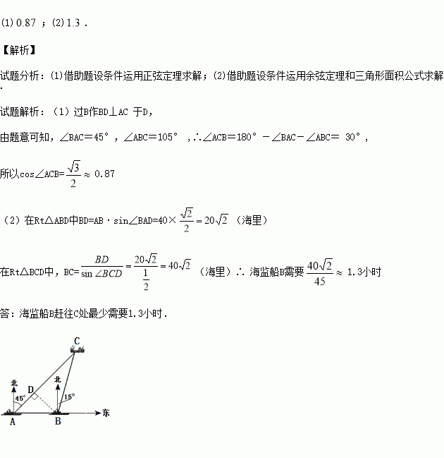 (2)海监船B奉命以每小时45海里的速度前往C处对某国舰船进行驱逐,那么海监船B到达C处最少需