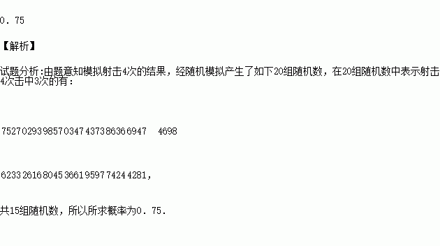 现采用随机模拟的方法估计某运动员射击4次,至少击中3次的概率:先由计算器给出0到9之间取整数值的随机数,指定0,1表示没有击中目标,2,3,4,5,6,7,8,9表示击中目标,以4个随机数为一组,代表射击4次的结果,经随机模拟产生了20组随机数: