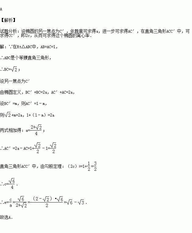 (2012秋•福州期末)在Rt△ABC中,AB=AC=1,若一个椭圆通过A、B两点,它的一个焦点为C,另一个焦点F在AB上,则这个椭圆的离心率为( )