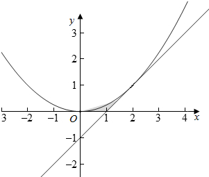 则由积分的几何意义可得所求的面积S=${∫}_{0}^{2}$$\frac{{x}^{2}}{4}$dx-${∫}_{1}^{2}$(x-1)dx=$\frac{{x}^{3}}{12}$|${\;}_{0}^{2}$-($\frac{1}{2}{x}^{2}$-x)|${\;}_{1}^{2}$=$\frac{2}{3}$-$\frac{1}{2}$=$\frac{1}{6}$,