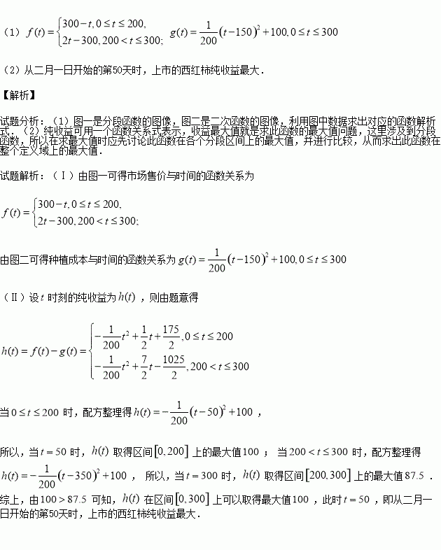 某蔬菜基地种植西红柿,由历年市场行情得知,从二月一日起的300天内,西红柿市场售价与上市时间的关系用图一的一条折线表示;西红柿的种植成本与上市时间的关系用图二的抛物线段表示.