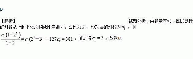在明朝程大位《算法统宗》中有这样的一首歌谣:“远看巍巍塔七层,红光点点倍加增,共灯三百八十一,请问尖头几盏灯?”这首古诗描述的这个宝塔其古称浮屠,本题说它一共有7层,每层悬挂的红灯数是上一层的2倍,共有381盏灯,塔顶有几盏灯?( )