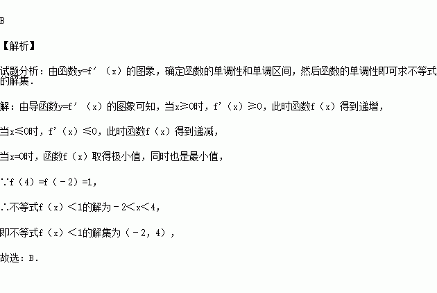 (2014•莘县校级模拟)已知定义在R上的函数f(x)满足f(4)=f(﹣2)=1,f′(x)为f(x)的导函数,且导函数y=f′(x)的图象如图所示.则不等式f(x)<1的解集是( )