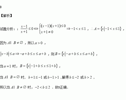 },B={x||x-b|≤a},若“a=1”是“A∩B≠Ф”的充分条件,则b的取值范围是( )