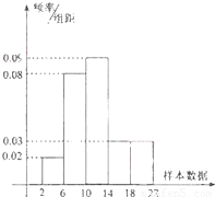 【答案】分析:由已知中的频率分布直方图,可得数据的组距为4,分别求出数据落在[2,10)内的矩形的高的和,代入频率=组距×矩形的高,即可求出频率.