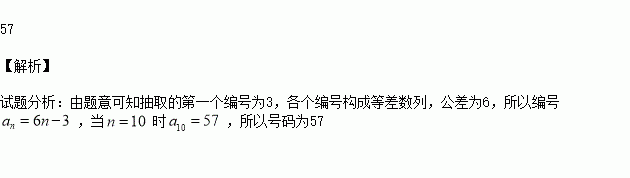 一个总体的60个个体的编号为0,1,2,3,…,59,现采用系统抽样的方法从中抽取一个容量为10的样本,请根据编号被6除余数为3的方法取组样本,则抽取的样本最大的一个号码为 .