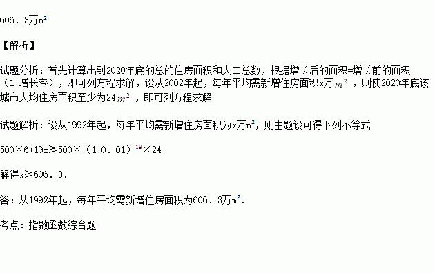 某城市1991年底人口为500万,人均住房面积为6m2,如果该城市每年人口平均增长率为1%,则从1992年起,每年平均需新增住房面积为多少万m2,才能使2010年底该城市人均住房面积至少为24m2?(可参考的数据1.0118=1.20,1.0119=1.21,1.0120=1.22).