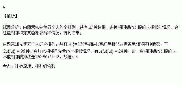 已知身穿红、黄两种颜色衣服的各有两人,身穿蓝颜色衣服的有一人,现将这五人排成一行,要求穿相同颜色衣服的人不能相邻,则不同的排法共有( )