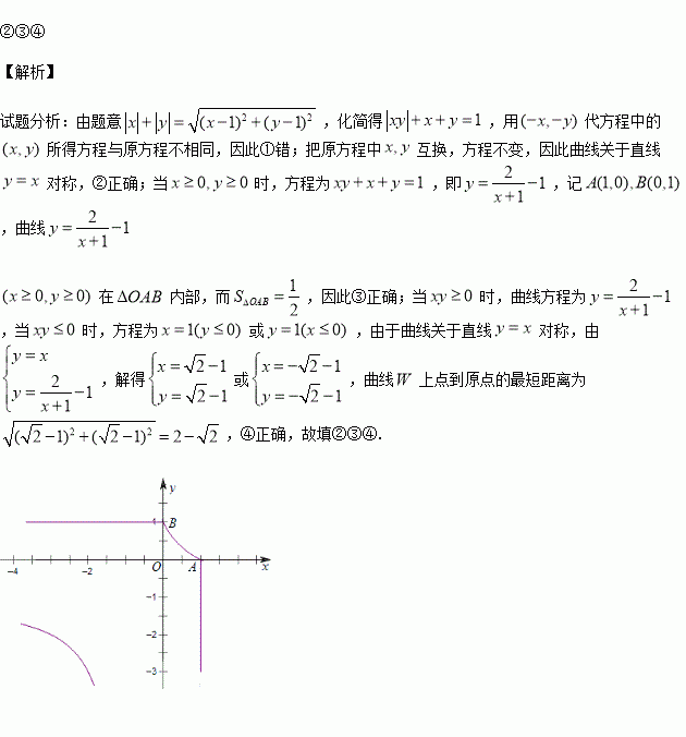 在平面直角坐标系中,动点P(x,y)到两条坐标轴的距离之和等于它到点(1,1)的距离,记点P的轨迹为曲线W,给出下列四个结论: