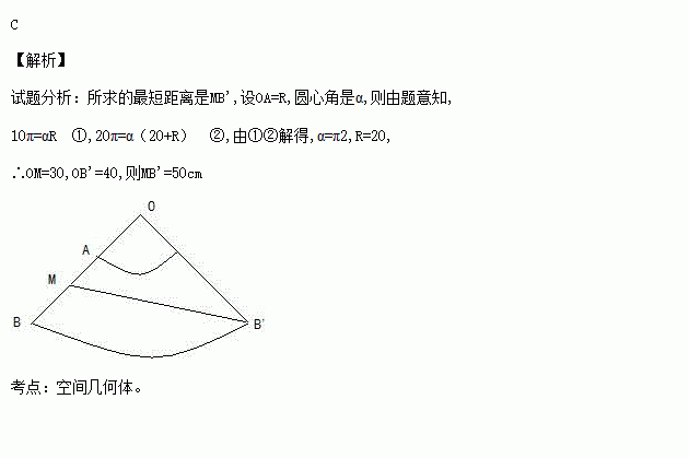 一圆台上底半径为5cm,下底半径为10cm,母线AB长为20cm,其中A在上第面上,B在下底面上,从AB中点M,拉一条绳子,绕圆台的侧面一周转到B点,则这条绳子最短长为( )
