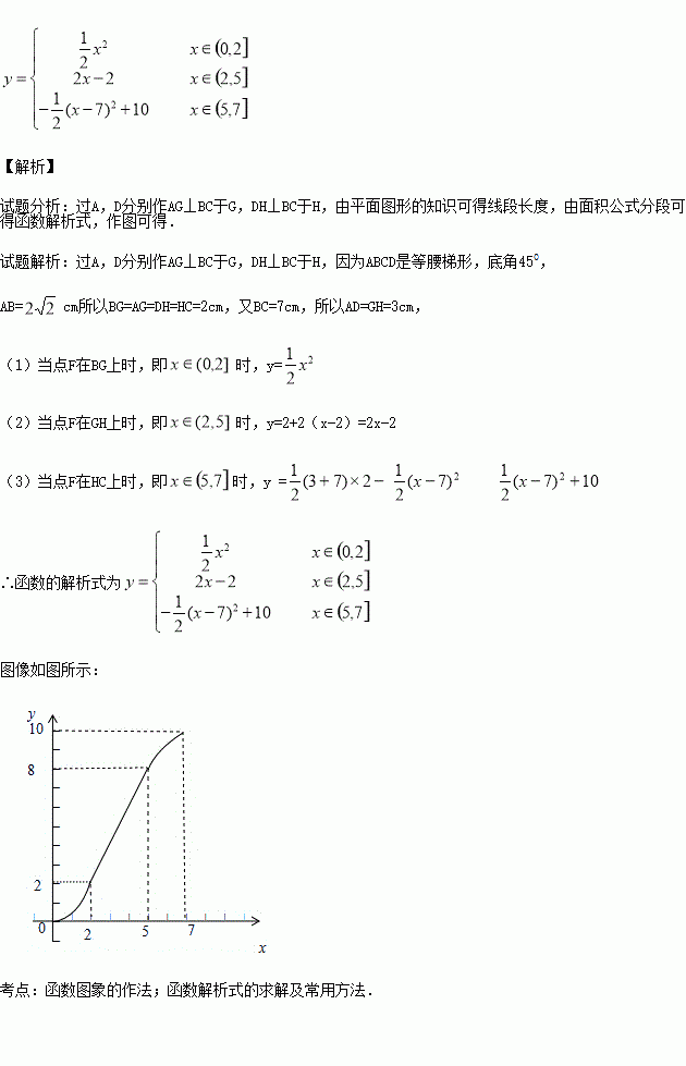 (本小题满分12分)如图,已知底角为450角的等腰梯形ABCD,底边BC长为7cm,腰长为