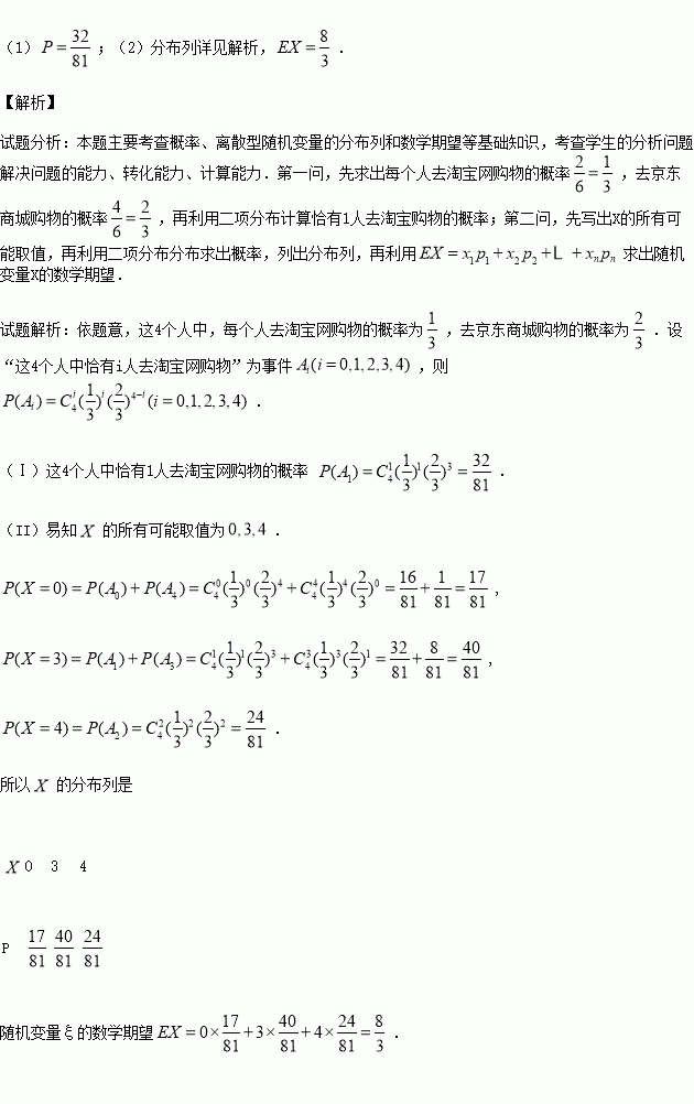 ÍøÉϹºÎïÖð²½×ß½ø´óѧÉú»î£¬Ä³´óѧѧÉúËÞÉá4ÈË»ý¼«²Î¼ÓÍø¹º£¬´ó¼ÒÔ¼¶¨£ºÃ¿¸öÈËͨ¹ýÖÀһöÖʵؾùÔȵÄ÷»×Ó¾ö¶¨×Ô¼ºÈ¥ÄļҹºÎÖÀ³öµãÊýΪ5»ò6µÄÈËÈ¥ÌÔ±¦Íø¹ºÎÖÀ³öµãÊýСÓÚ5µÄÈËÈ¥¾©¶«É̳ǹºÎÇҲμÓÕß±ØÐë´ÓÌÔ±¦ÍøºÍ¾©¶«É̳ÇÑ¡ÔñÒ»¼Ò¹ºÎï¡£