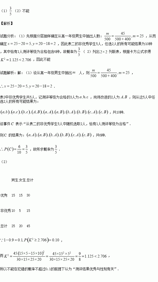 在中学生综合素质评价某个维度的测评中,分“优秀、合格、尚待改进”三个等级进行学生互评.某校高一年级有男生500人,女生400人,为了了解性别对该维度测评结果的影响,采用分层抽样方法从高一年级抽取了45名学生的测评结果,并作出频数统计表如下: