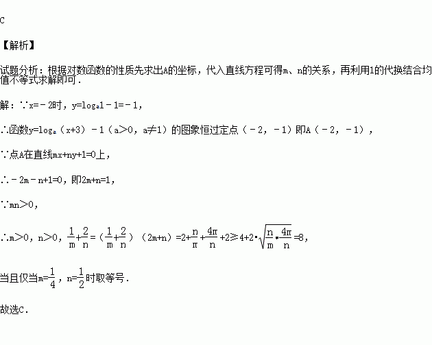 (2012•三水区模拟)函数y=loga(x+3)﹣1(a>0,且a≠1)的图象恒过定点A,若点A在直线mx+ny+1=0上,其中m,n均大于0,则