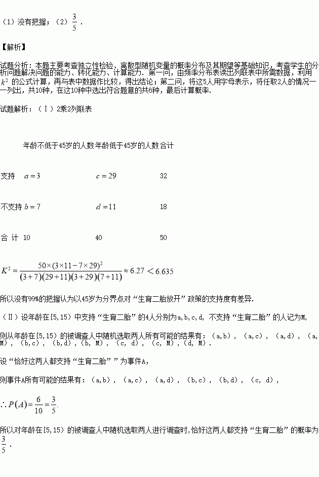 £¨¢ñ£©ÓÉÒÔÉÏͳ¼ÆÊý¾ÝÌîÏÂÃæ2³Ë2ÁÐÁª±í£¬²¢ÎÊÊÇ·ñÓÐ99£¥µÄ°ÑÎÕÈÏΪÒÔ45ËêΪ·Ö½çµã¶Ô¡°ÉúÓý¶þÌ¥·Å¿ª¡±Õþ²ßµÄÖ§³Ö¶ÈÓвîÒ죻