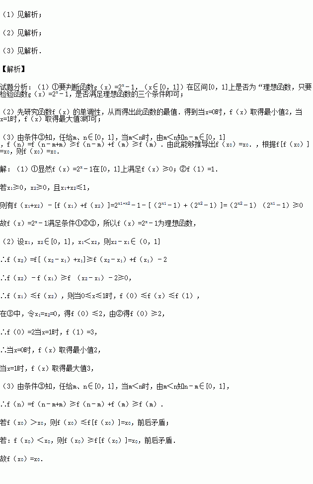 (3)若f(x)为理想函数,假设存在x0∈[0,1]满足f[f(x0)]=x0,求证:f(x0)=x0.