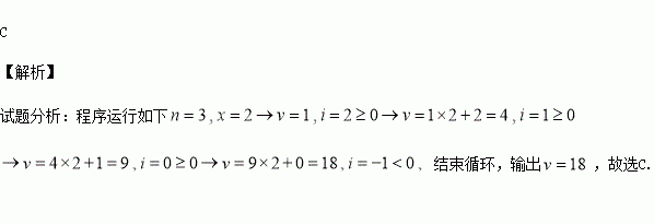 秦九韶是我国南宋时期的数学家,普州(现四川省安岳县)人,他在所著的《数书九章》中提出的多项式求值的秦九韶算法,至今仍是比较先进的算法。如图所示的程序框图给出了利用秦九韶算法求多项式值的一个实例,若输入n,x的值分别为3,2,则输出v的值为