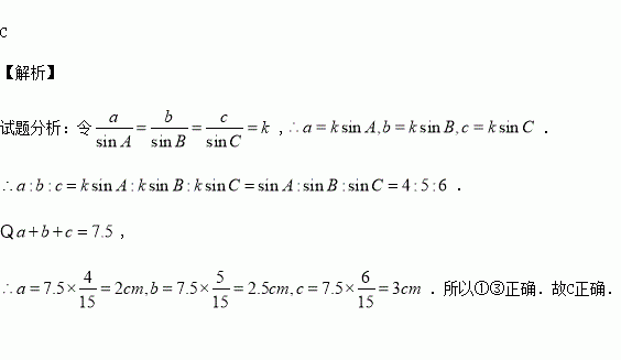 在△ABC中,周长为7.5cm,且sinA:sinB:sinC=4:5:6,下列结论:
