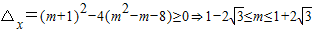 △=4(m+1)2-8(m2-8)>0⇒-3<m<5