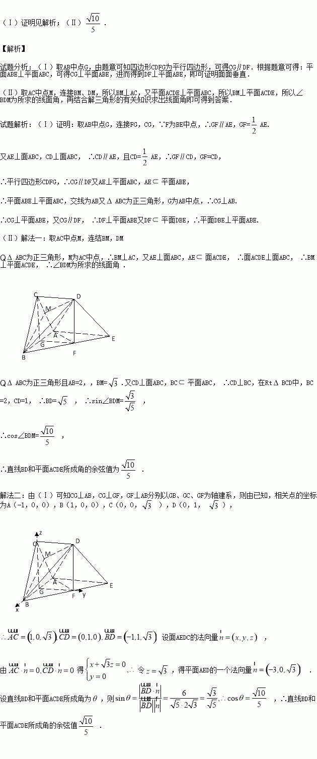 在如图所示的几何体中, △ABC为正三角形,AE和CD都垂直于平面ABC,且AE=AB=2,CD=1,F为BE的中点.