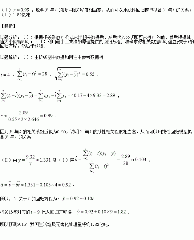 (Ⅱ)建立y关于t的回归方程(系数精确到0.01),预测2016年我国生活垃圾无害化处理量.