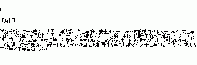 汽车的“燃油效率”是指汽车每消耗1升汽油行驶的里程,下图描述了甲、乙、丙三辆汽车在不同速度下的燃油效率情况.下列叙述中正确的是( )
